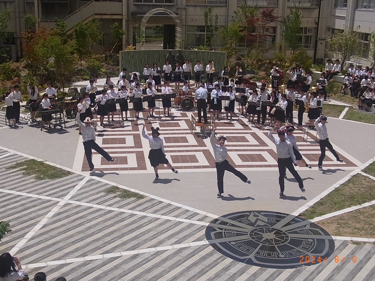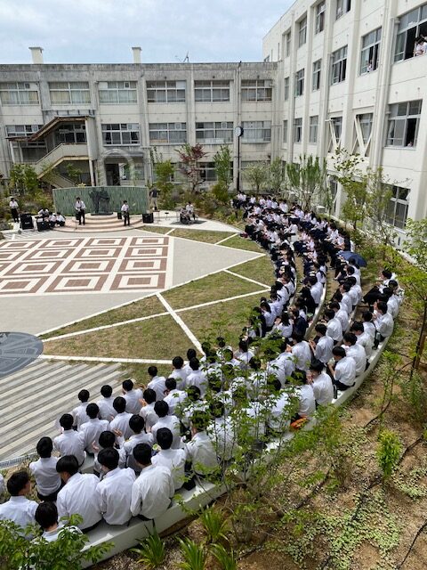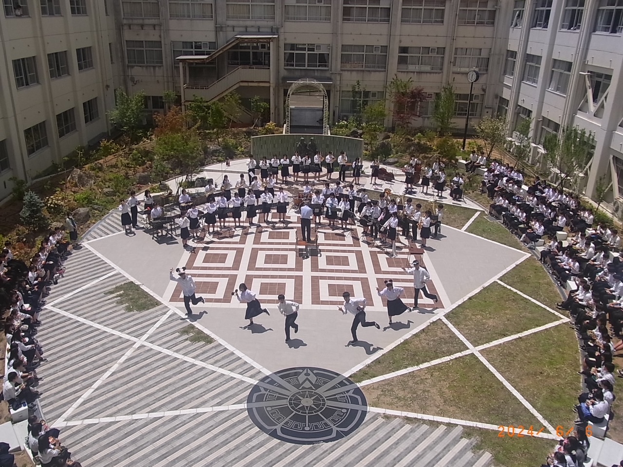 通常授業のお昼休み、中庭ランチコンサートが開催されました。お弁当箱を膝に置いて食べたり、おしゃべりを楽しんだり、スマホで写真を撮ったり、歓声を送ったり。様々な形で生徒の皆さんがランチタイムを楽しんでいました。